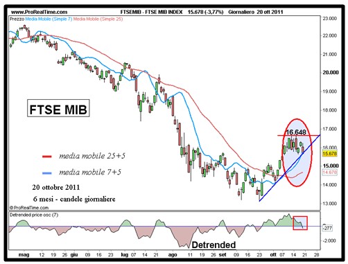 Con la giornata odierna, inoltre, il Ftse Mib è scivolato leggermente sotto la trendline (retta blu) che ne ha accompagnato il rialzo iniziato il 23 settembre.