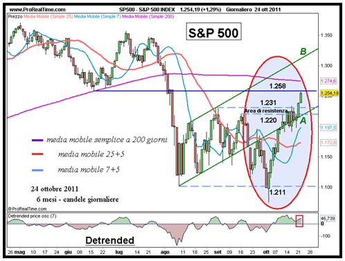 L’indice americano è ormai a ridosso della resistenza a 1.258 punti ed è vicino proprio alla media mobile a 200 giorni (attualmente si muove a 1.274 punti).