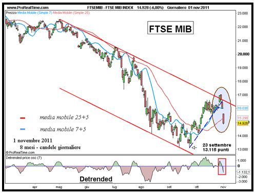 In un sol colpo l’indice ha perforato la 7+5 e la 25+5, invertendo al ribasso contemporaneamente il trend di medio e di lungo periodo.