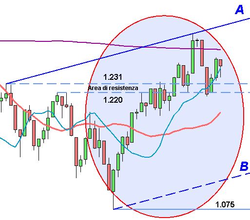 In seguito è sceso, arrestando il proprio calo ancora una volta in coincidenza proprio dell’area 1.220-1.231, per poi rimbalzare .