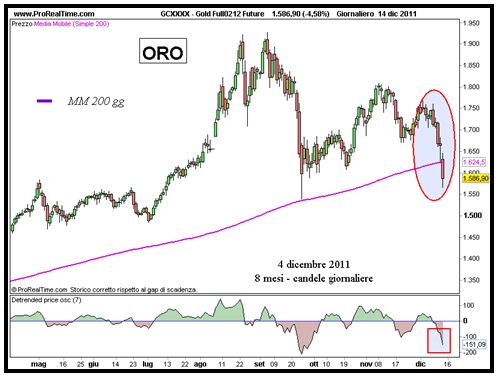 L’oro è scivolato sotto la media mobile a 200 giorni, con conferma in chiusura.