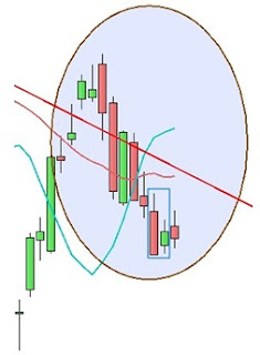 Avendo saltato un giorno, facciamo un passo indietro evidenziando che con la chiusura di ieri era comparsa nel grafico una Harami Bullish (vedi candele nel rettangolo azzurro) della quale propongo un esempio scolastico: